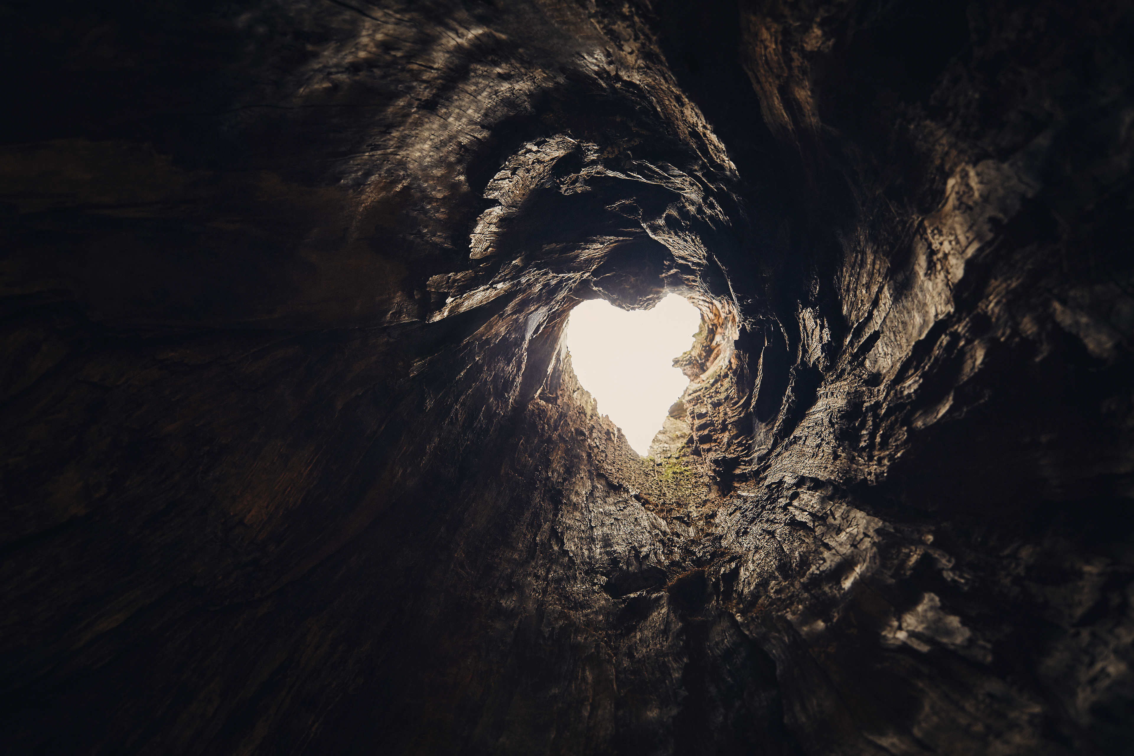 Standing inside an old trunk revealling it's heart, pointing directly to the sky.